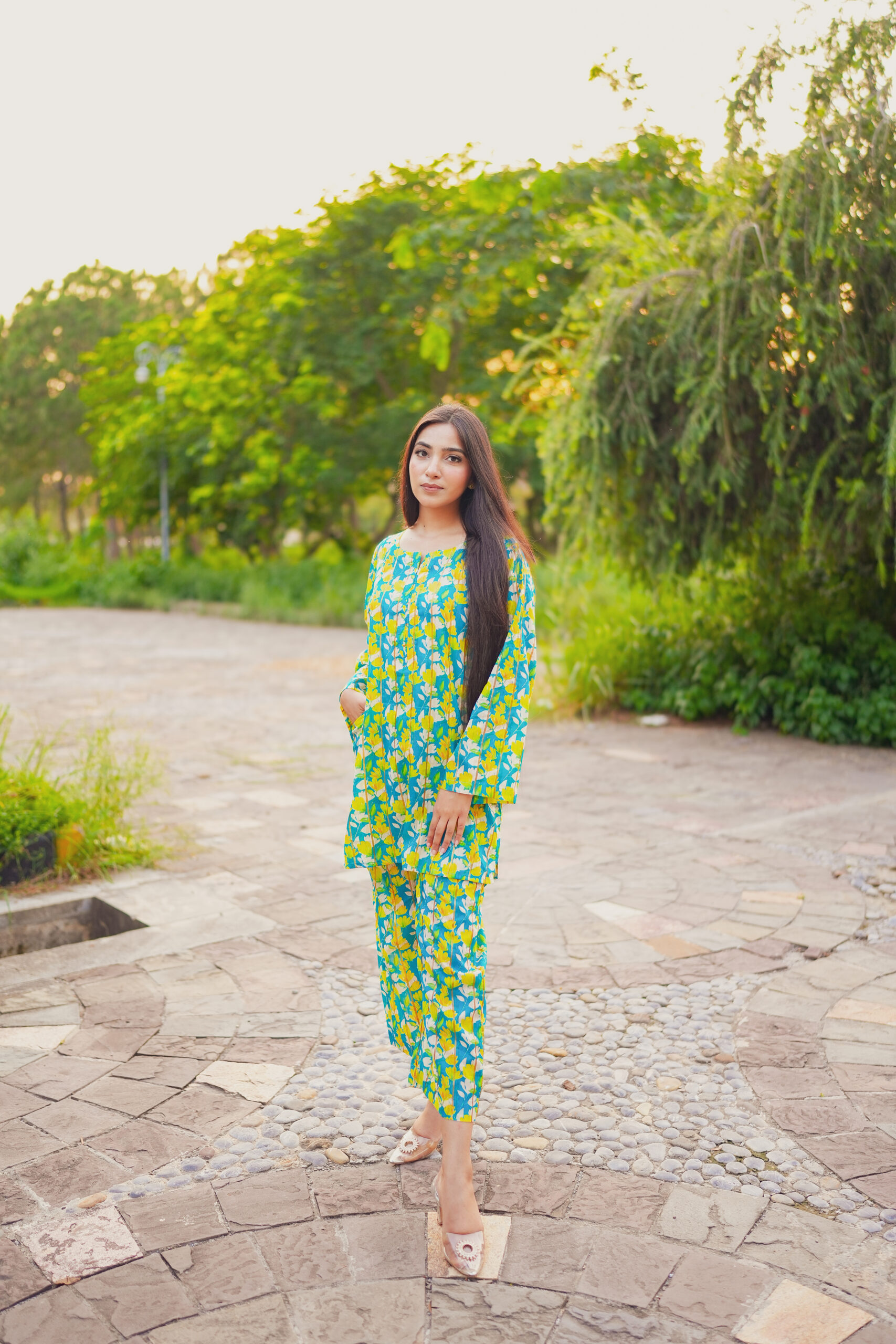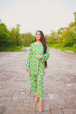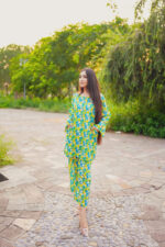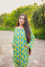 This doria lawn suit features a vibrant and lively design, perfect for warm weather. The suit showcases a refreshing color palette of bright blue and yellow with a floral print, creating a cheerful and summery look. The fabric is light and airy, offering comfort while maintaining a stylish appearance. The shirt has a loose, flowing silhouette with a simple round neckline and long sleeves, ensuring ease of movement. Paired with matching trousers, this lawn suit is an ideal choice for casual outings or daytime events, combining comfort with a trendy, eye-catching design.