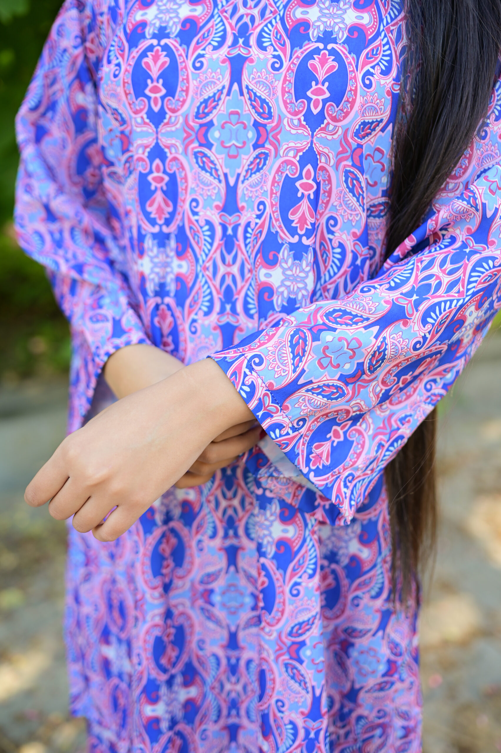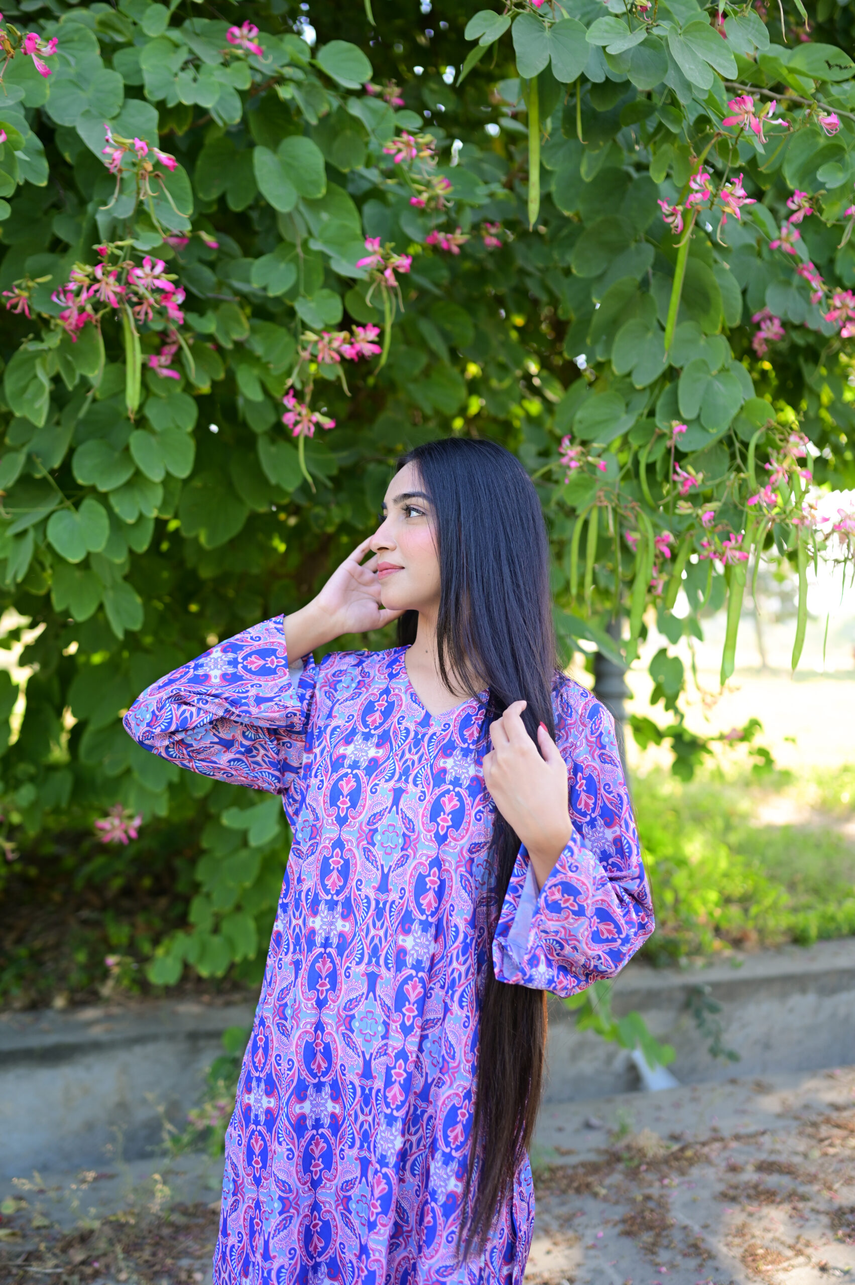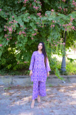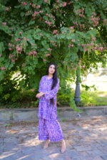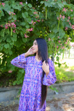 This beautiful silk dress is perfect for any special occasion or formal event. The dress features a vibrant purple color and an intricate floral pattern that adds a touch of elegance and sophistication. The flowing design of the dress allows for a comfortable fit and a graceful appearance. The dress can be worn to any event where a stylish and eye-catching outfit is desired. The silk material also ensures that the dress remains comfortable and breathable, making it a great choice for warm weather or indoor events.